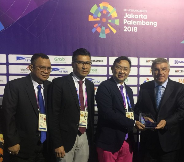 IOC President Thomas Bach was guest of honour on Squash team finals day at the Gelora Bung Karno Sports Complex. Picture below shows Bach, far right, receiving a presentation from Asian Squash Federation President David Mui.